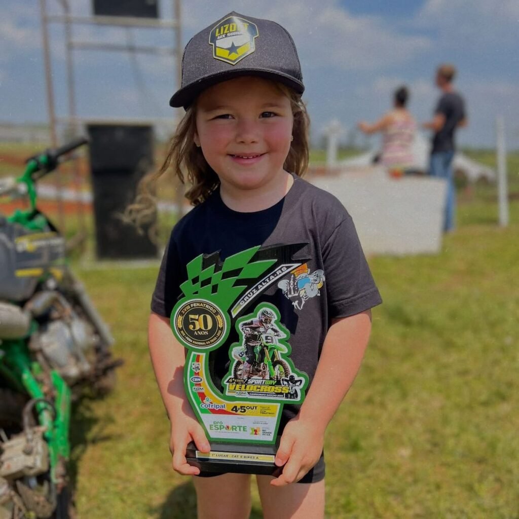 A pequena Martina Marchezan Andrade conquistou a primeira posição na sua categoria, no campeonato gaúcho de Velocross em Cruz Alta. Martina tá seguindo os passos do papai “Bolinha” que conquistou um quinto lugar após tempo afastado das pistas, do vô “Boca”, do dindo mano e do tio Pedro Marchezan.