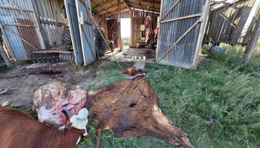 No momento da abordagem, os agentes surpreenderam três indivíduos enquanto carneavam uma vaca recém-abatida. No local, também foi constatado que outro animal já havia sido abatido anteriormente, sendo encontradas partes da carcaça e instrumentos utilizados no abate.